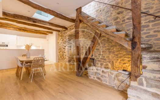 Cette maison atypique T5 de 132m2 vous offre en RDC, une première partie comprenant l’espace cuisine, salon et accès à l’étage, ainsi qu’une seconde partie comprenant l’espace nuit et salle d’eau.